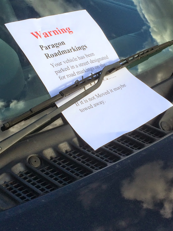 On the off chance that the reasons were unclear, the windscreens have been decorated with an explanation, telling drivers that the car must be Moved (their capitals, not mine) or it maybe (sic) towed away:
